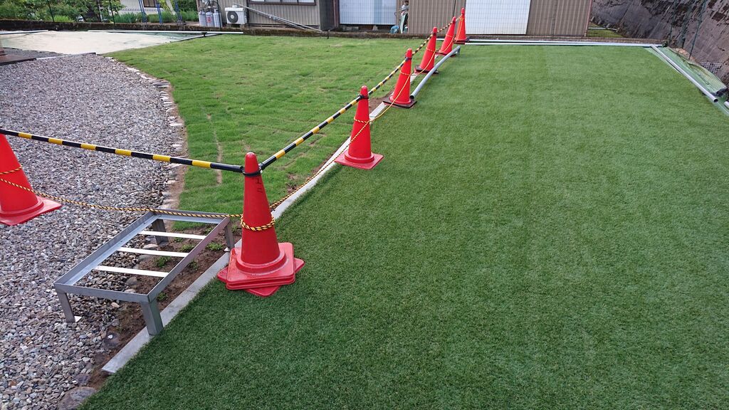 芝は順調に育っておりますが、すずうたにやられるのでカラーコーンでバリケード中です