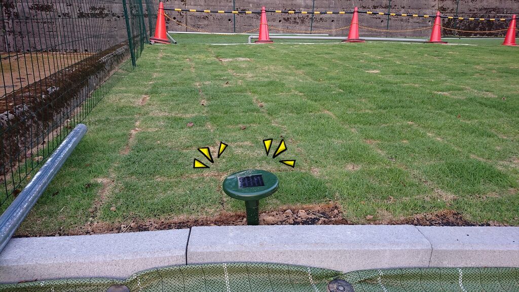 画像のソーラーの音波出すやつは問題外、その他忌避剤いろいろやりましたがどれもダメですよー