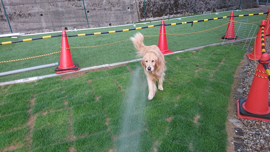 芝生の水やり中にシャワーの水に突入するのも覚えたようです