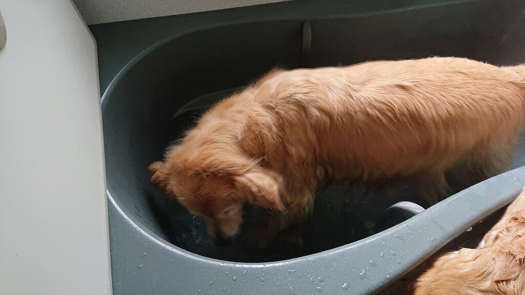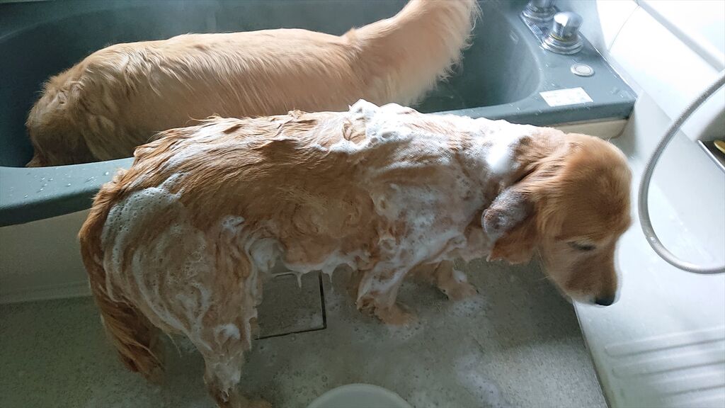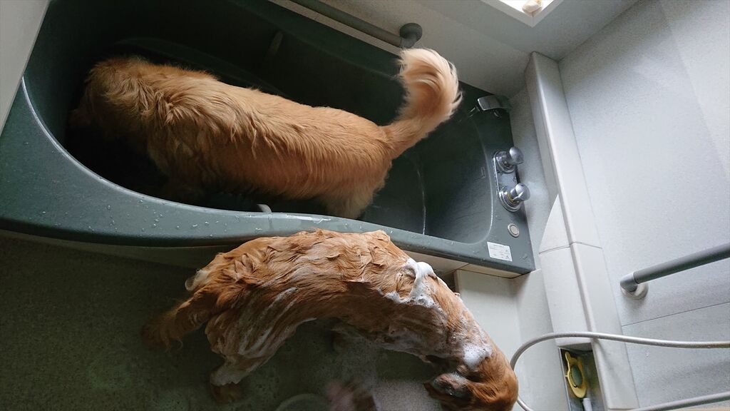 洗われるうーちゃんの横でノーテンキにカキカキに興じるすうちゃん